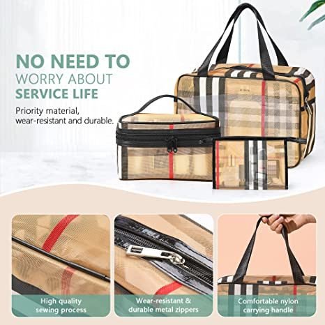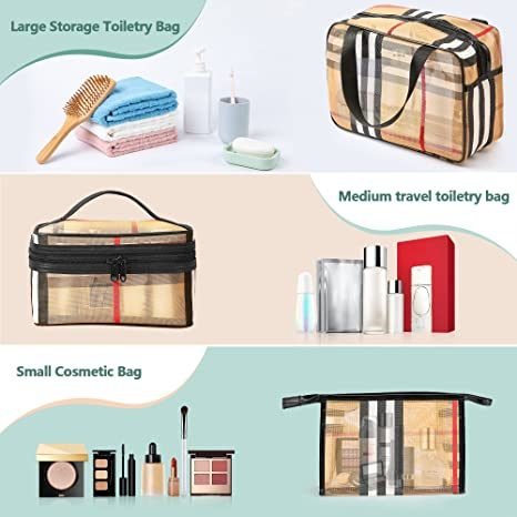 1.3 DIFFERENT SIZES:Contains one large toiletry bag, one medium makeup bag, and a small cosmetic bag. Different sizes make your need a bathroom, traveling and organizing. And It is also suitable for your daily life.